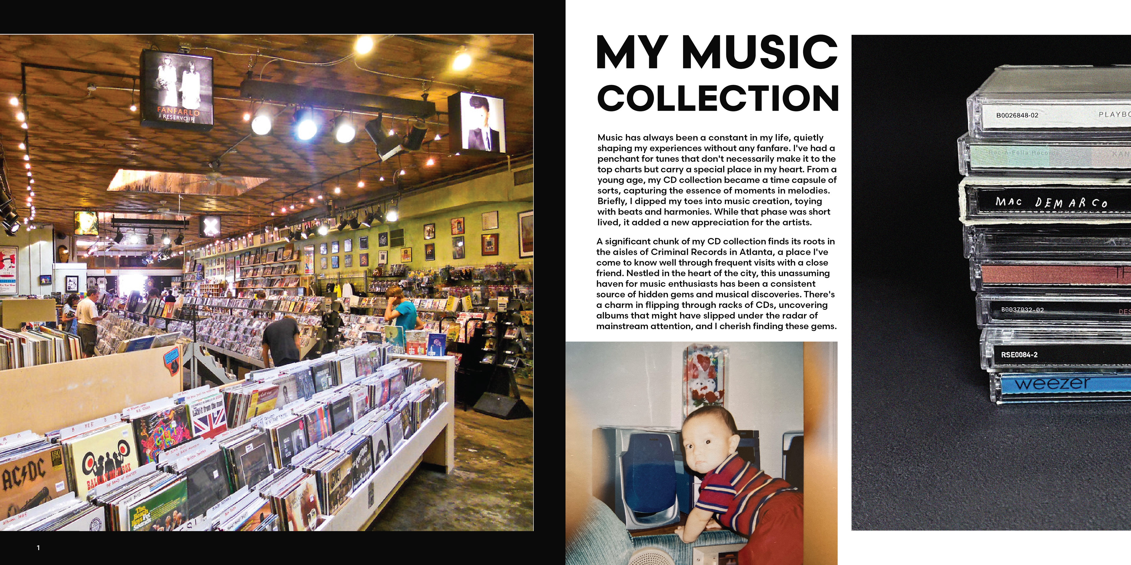 Melodies & Memories is a self-authored editorial project that explores a selection of CDs from my personal collection. Each entry pairs factual information about the album with a personal reflection, linking the music to memories, moods, and experiences that have shaped my connection to each disc. The goal was to transform a physical collection into a meaningful narrative experience.